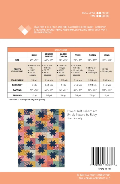 Whether you're a beginner or an experienced quilter looking to refine your skills, this class is designed to guide you through the process of making a quilt from start to finish. During this class you will learn fundamental techniques including cutting, piecing, machine and/or hand quilting, and binding. Star Pop II is a fun pattern, perfect for playing with color and prints. The pattern includes all the quilt sizes from baby size all the way up to king size, but we recommend that you make a baby or small throw in order to *finish by the end of class. This quilt is fat quarter, fat eighth and layer cake and friendly.